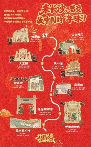 这不是一次简单的年画悬挂。太平街、天心阁、岳麓山、火宫殿、古浏阳门、都正街、东茅街、登隆街、湖南省圆点美术馆——九处城市地标,每一处都迎来了一幅“量身定制”的巨幅年画。这些年画不是孤立的装置艺术,而是一把把解读城市文化基因的钥匙。穿行其间,市民如同漫步于一座没有围墙的“露天年画博物馆”。