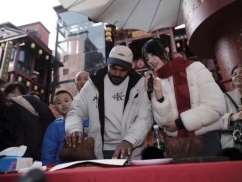 与此同时,火宫殿内非遗年俗公益手作体验同步展开。滩头年画非遗传承人现场授课,指导市民与外国友人拓印年画、书写福字。一台湖南日报“拍报机”前排起长队,十几秒即可获得一份印有个人照片的专属纪念报,成为全场最受欢迎的互动环节。